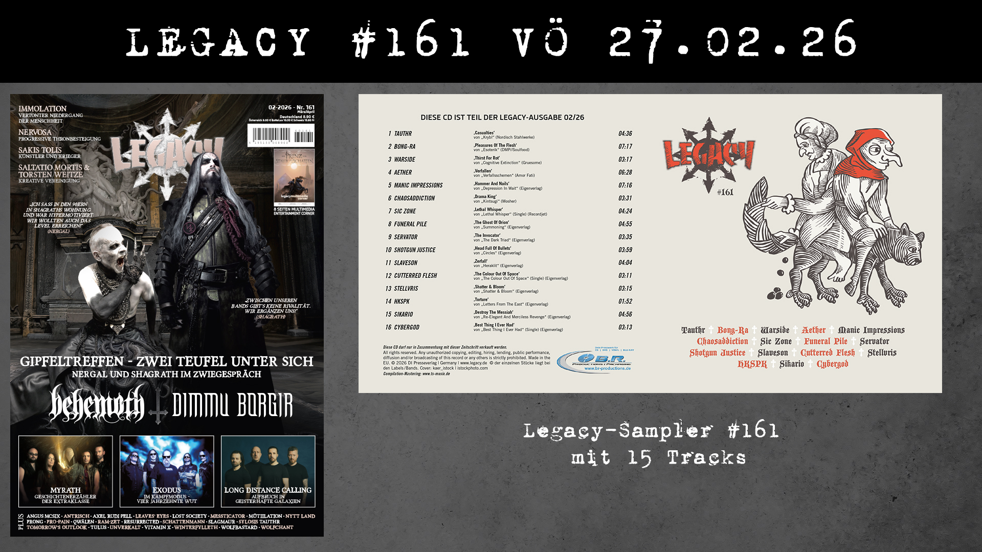 1. LEGACY-COMPILATION mit 16 Tracks: Tauthr, Bong-Ra, Warside, Aether, Manic Impressions, Chaosaddiction, Sic Zone, Funeral Pile, Servator, Shotgun Justice, Slaveson, Cutterred Flesh, Stellvris, HKSPK, Sikario, Cybergod