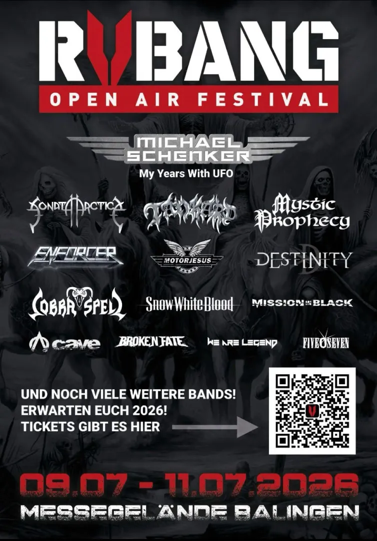 Als Headliner brennen unsere Lieblings-New-Yorker Overkill ein Thrash-Feuerwerk der alten Schule ab. Nach dem brutal starken „Scorched“ aus dem Jahr 2023 sind Blitz & Co. wieder in aller Munde und stehen voll im Saft. Ähnliches kann man auch von „The German Wunderkind“ Michael Schenker sagen, der den zweiten Headliner-Slot ergattern konnte und gefühlt ständig um die Welt tourt. Balingen kommt in den Genuss des „My Years With UFO“-Programms. Damit sind Hits wie 'Doctor Doctor', 'Lights Out' oder 'Rock Bottom' natürlich gesetzt. Und damit ist auch klar, dass Stimmwunder Roberto Dimitri „Lia“ Liapakis den doppelten Aufwand betreiben muss. Denn seine Stammcombo Mystic Prophecy ist ebenfalls beim RVBang am Start, um den „Hellriot“ zu entfesseln.