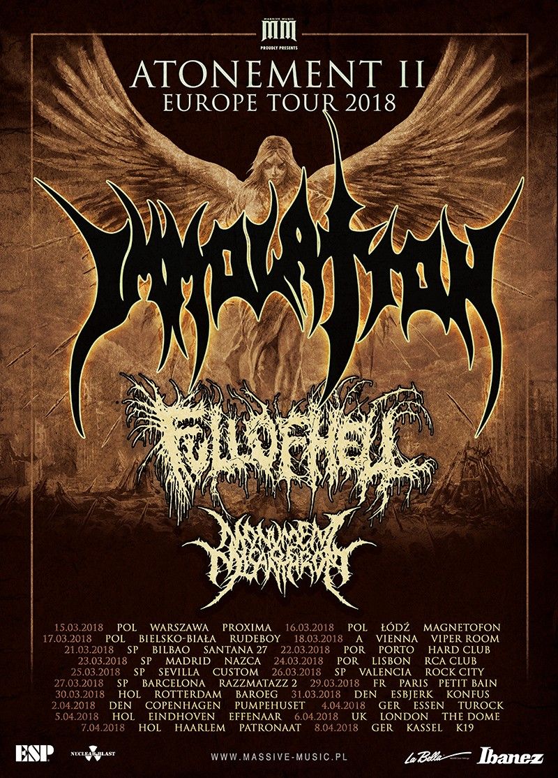 Mit Todesblei-Attacken und Grindcore-Punches werden sich die Amis IMMOLATION gemeinsam mit ihren Kollegen von FULL OF HELL (neuestes Album "Trumpeting Ecstasy", das 2017 via Profound Lore erschienen ist) und MONUMENT OF MISANTHROPY (neueste MCD "Capital Punisher", die im Dezember 2017 in Eigenregie erschienen ist) auf Tour durch Europa aufbrechen. Die Tour startet am 15. März in Spanien und endet am 8. April in Deutschland.