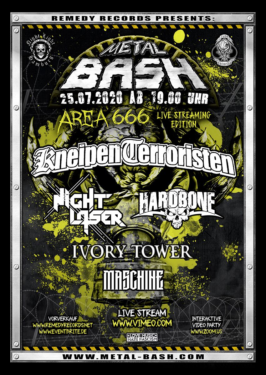 Da die Open Air Saison dieses Jahr aus bekannten Gründen nicht stattfinden kann, bringen wir euch das Metal Bash am Samstag den 25.07.2020 eben nach Hause ! Wir bringen euch ein vollwertiges, abendfüllendes Mini - Festival mit allem drum und dran - grosser Bühne, fetter Lichtshow und echter Clubatmosphäre zu euch ins Wohnzimmer, in den Garten, wo auch immer ihr den Metal Bash Live Stream feiern wollt. Freut euch auf HARDBONE, KNEIPENTERRORISTEN, NIGHT LASER und IVORY TOWER !