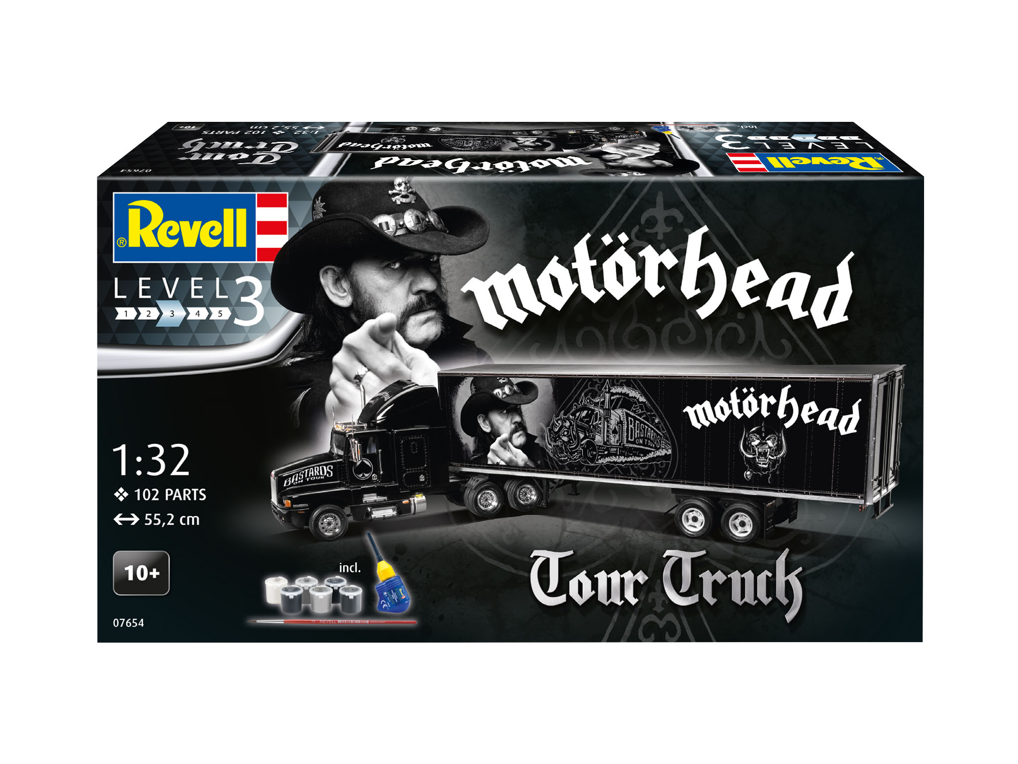 Auf Fans von Lemmy & Co wartet dagegen eine Herausforderung, denn für den Motörhead Tour Truck als Modellbausatz muss zu Kleber und Farbpinsel gegriffen werden – mit dem Schwierigkeitsgrad Level 3 sehen aber auch Gelegenheitsbastler beeindruckende Erfolge. Belohnt wird die Bastelarbeit mit einem spektakulären Truck und Trailer der „Bastards on Tour“ mit vielen Chromteilen, darunter etwa Felgen oder Außenspiegel, und einer einteiligen Kabine mit separatem Grill. Damit der Zusammenbau für den Truck der schnellsten und lautesten Band der Welt sofort losgehen kann, sind Klebstoff und Basisfarben im Set bereits enthalten. Das Schwierigkeits-Level liegt bei 3, so dass sich auch Gelegenheitsbastler ohne Probleme an den Zusammenbau des 55,2 cm langen Trucks wagen können.