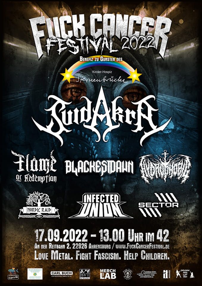 Welche Bands die Bühne entern werden, könnt ihr dem Flyer entnehmen, und wir übergeben hiermit einfach mal das Wort an Veranstalter Marko: „Seit dem Jahr 2016 veranstalten wir das Fuck Cancer Festival in Ahrensburg. Ziel war es seit Beginn, nicht nur eine ausgelassene Metal- und Rockveranstaltung zu feiern, sondern zeitgleich auch möglichst viel Geld für verschiedene Projekte und einen guten Zweck zu sammeln. So wird das Festival inzwischen zum sechsten Mal zugunsten des Kinderhospiz Sternenbrücke e.V. und "Inklusion Muss Laut Sein" ausgetragen.