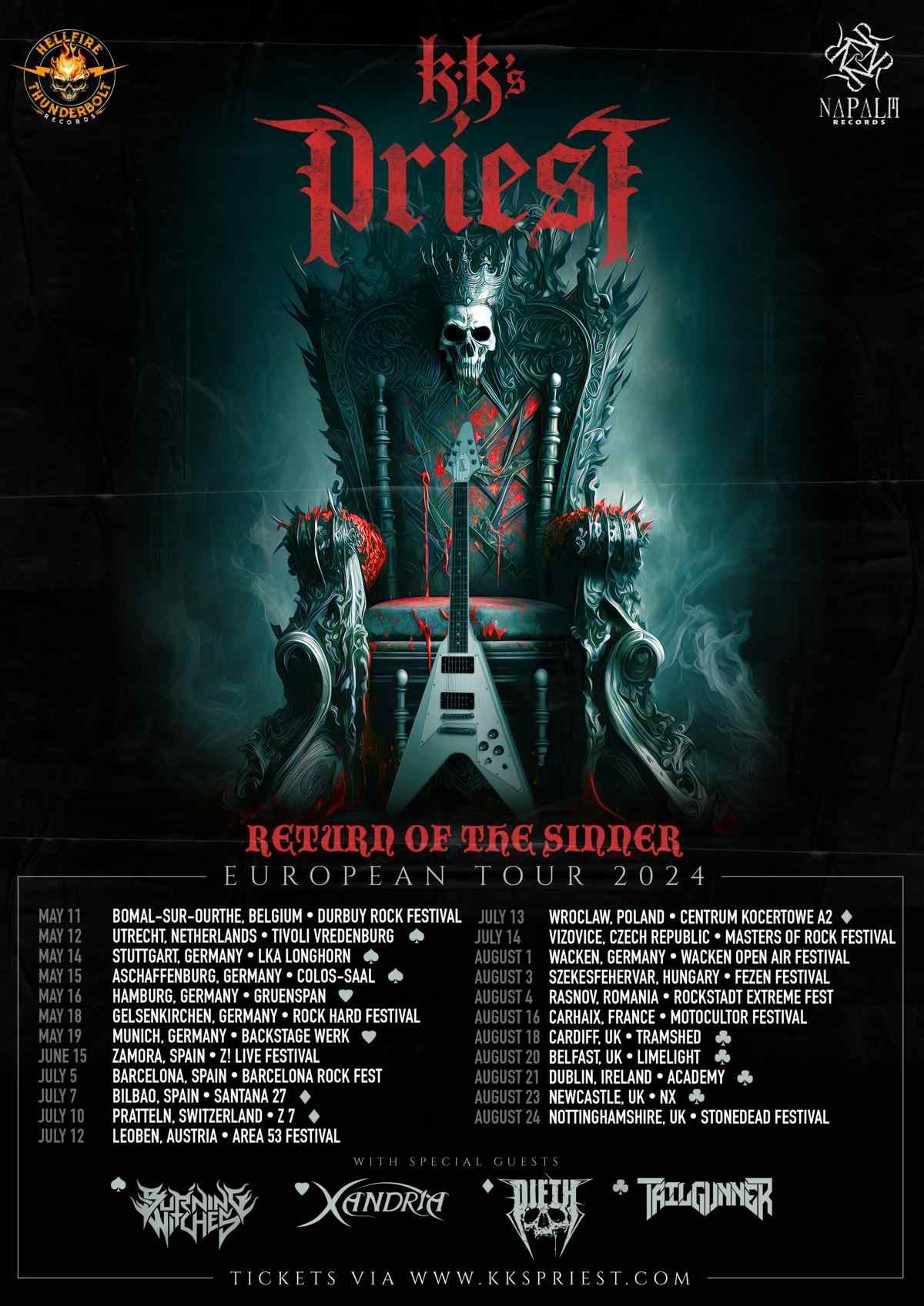 KK'S PRIEST kündigen ihre erste Europa-Headliner-Tour an und machen keine halben Sachen, wenn man sich so die Latte an Terminen anschaut. Mit im Gepäck haben sie Burning Witches, Xandria, Dieth und Tailgunner – welche Band bei welchen Terminen dabei ist, könnt ihr dem Flyer entnehmen.