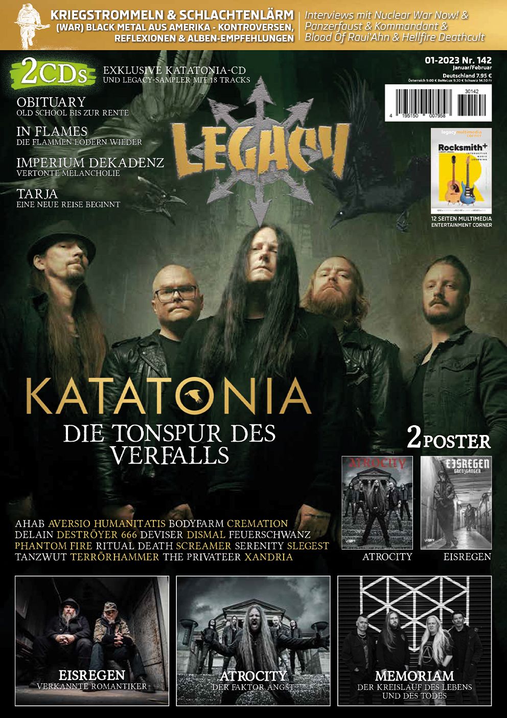 Katatonia & War (Black) Metal aus Amerika: Die schwedischen Legenden Katatonia sind seit über 30 Jahren Meister darin, melancholische Soundlandschaften zu erschaffen. Ging es früher noch rauer und ruppiger zur Sache, nähern sich die Herren langsam einer perfekten Symbiose aus metallischen und Pop-artigen Trauersounds an. Herausgekommen ist mit „Sky Void Of Stars“ eine besondere Tonspur des Verfalls, die zu Recht auch unseren Soundcheck gewonnen hat. Im Gespräch mit Niklas Sandin sowie Jonas Renkse und dem Cover-Künstler Roberto Bordin finden wir alles über die neue Scheibe heraus. Quasi als Gegenpol zu den sanften Tönen haben wir uns für die neue Ausgabe auf einen Grenzgang gewagt und thematisieren auf neun Seiten die Verbindung zwischen Krieg und (Black) Metal. Warum sind Kriegsbilder und -metaphern so wichtig in der harten Musikrichtung? Wo geht es um Schock und Provokation? Wo um ernsthafte Reflexion in der Kunst? Was hat es mit scheinbaren Werten wie Heldenmut, Glorie und so weiter auf sich? Gemeinsam mit unseren Gesprächspartnern Yosuke (Nuclear War Now!), James Bresnahan (Kommandant), Brock Van Dijk (Panzerfaust) und vielen mehr haben wir versucht, dies aufzuarbeiten. Damit nicht genug! Sowohl Eisregen als auch Atrocity und Memoriam liefern bockstarke neue Scheiben ab, weshalb wir alle drei Bands zum ausführlichen Gespräch baten. Natürlich haben wir uns auch sonst vieles zur Brust genommen, was diesen Winter erscheint. So reisen wir mit Tarja Turunen (Ex-Nightwish) im Kontext ihres ersten Best-Of-Albums durch die finnische Kälte, fragen In Flames, wie Metal ihr neues Werk geworden ist, und stellen fest, dass die amerikanischen Death-Metaller Obituary mal wieder richtig was vorgelegt haben. Außerdem: Freut Euch über die ersten größeren Festival-Vorberichte für den kommenden Sommer – es wird einige alte und neue (Tolminator!) Highlights geben!